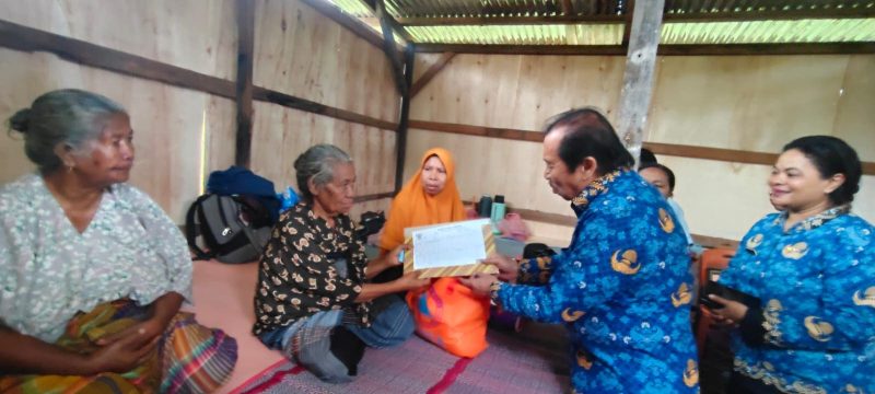 Didampingi Plt. Kepala Dinas Sosial Maria Angelina Adriana Sekke Wea, Bupati Simplisius menyerahkan bantuan logistik dan paket sembako kepada Helena Bheda, istri almarhum yang kini tinggal di bangunan darurat tak jauh dari puing rumah mereka di RT 05, Dusun III.