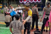 LARANTUKA, FLORESPOS.net-Kapolres Flores Timur, Polda NTT, AKBP I. Nyoman Putra Sandita menyiram air kembang ke 16 anggotanya di depan halaman apel Mapolres setempat, Selasa…
